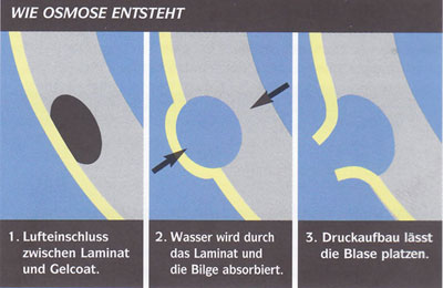 Sind die Bläschen mit einer graugrünen oder braunen Substanz gefüllt, die nach Essig riecht, liegt Osmose vor.